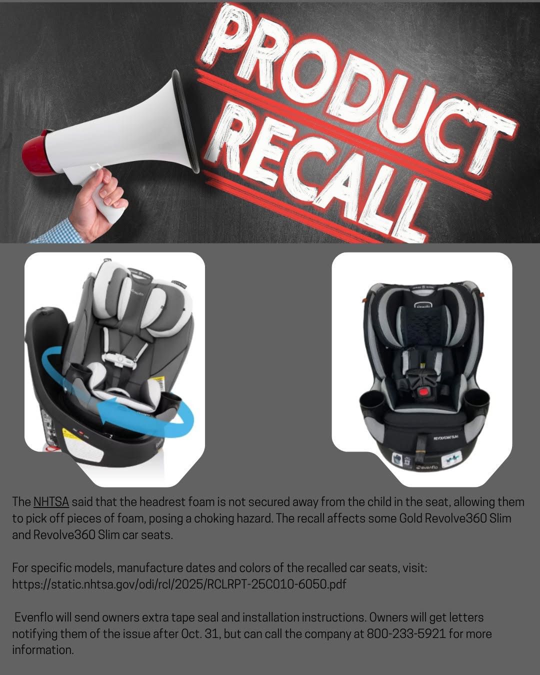 El Departamento de Policía de Dunwoody advirtió a los padres y cuidadores sobre un retiro urgente emitido por la Administración Nacional de Seguridad del Tráfico en las Carreteras (NHTSA) para ciertos asientos infantiles Evenflo Gold Revolve360 Slim y Revolve360 Slim, fabricados entre el 1 de diciembre de 2022 y el 8 de diciembre de 2024.